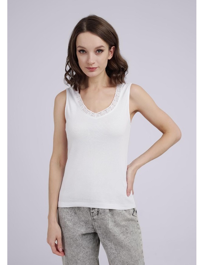 Базовая, малообъемная майка из трикотажного, эластичного полотна. V-образная горловина обработана кружевом. Широкая бретель. Производство Узбекистан.
