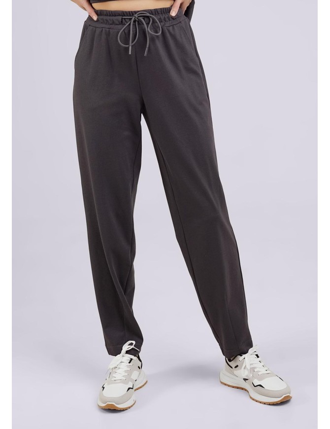 Брюки из трикотажного полотна пике, зауженные. Притачной пояс со шнуром. Боковые карманы с отрезным бочком. По низу брюк вытачки. Спереди принт.