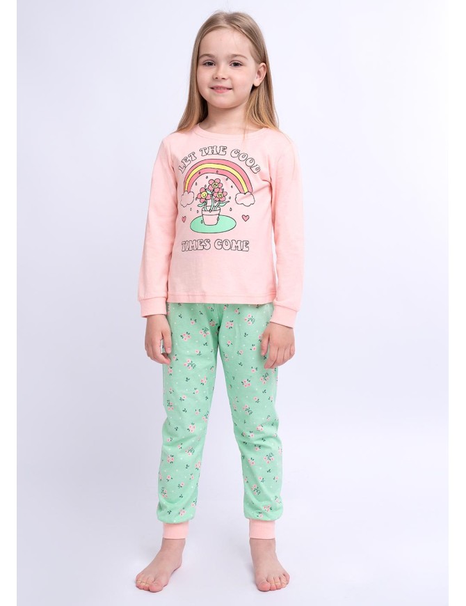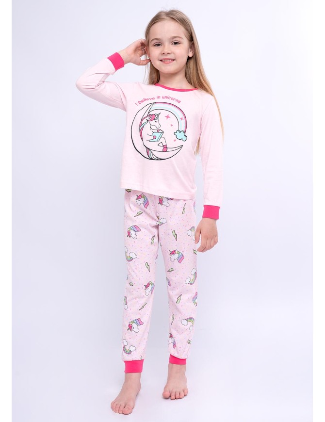 Очаровательная хлопковая пижама. Обтачка горловины , манжеты по низу рукава и брюк из эластичного полотна. Джемпер с удлиненной спинкой. Пояс брюк с резинкой. Модель украшена оригинальным ярким принтом.