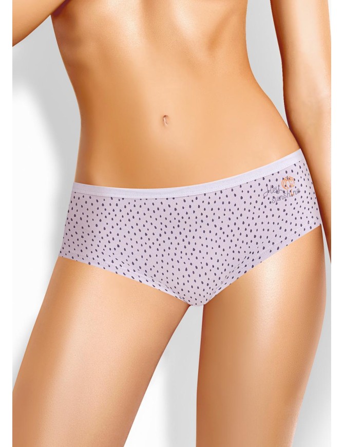 Трусы шорты женские из эластичного хлопкового полотна. Обработка краев по талии окантовочная резинка, по ноге - подгибка. По переду принт.