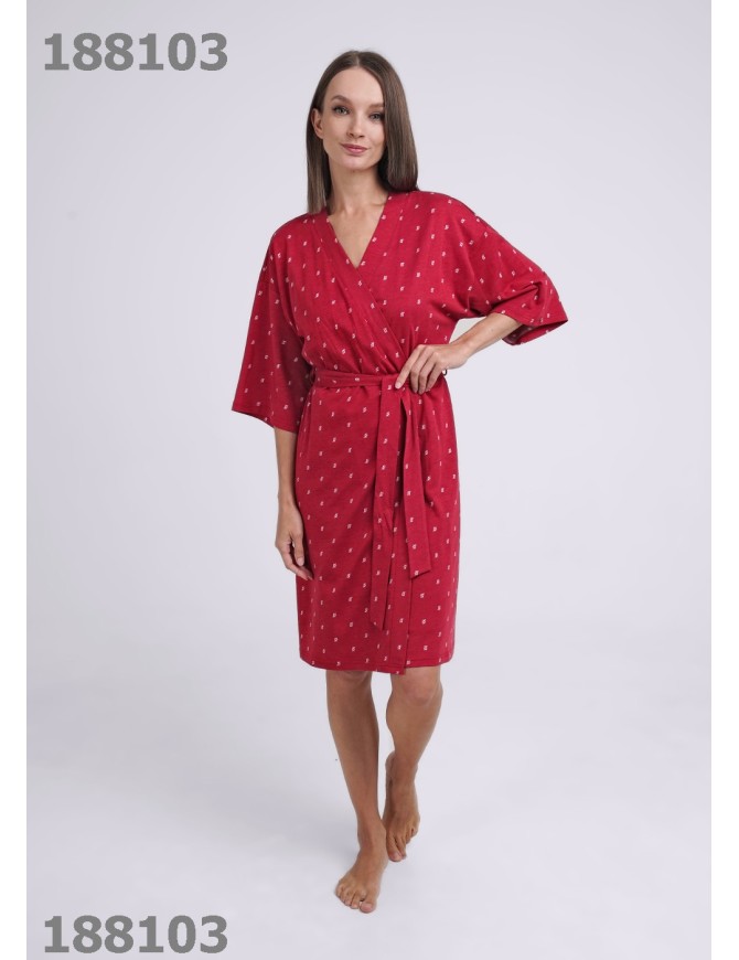 Халат для дома из трикотажного полотна с хлопком и модалом в составе. Свободнй крой на запах, с поясом. По горловине и борту обтачка. Спущенная линия плеча, рукав длиной 3/4. На рукаве нашивка металл.