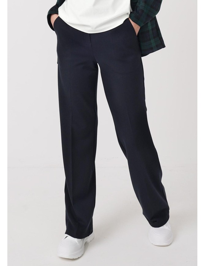 Брюки со стрелками из трикотажного полотна "джерси". Отрезной пояс со шлевками. Застежка на молнию и внутренний крючок. По бокам функциональные карманы.