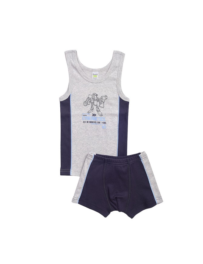 Майка с разрезными бочками, на полочке контрастного цвета принт, по шву соединения центральной и боковых деталей полочки - отделочный кант. Обработка бейкой. Боксеры с контрастными боковыми вставками и отделочным кантом. Материал-рибана.
