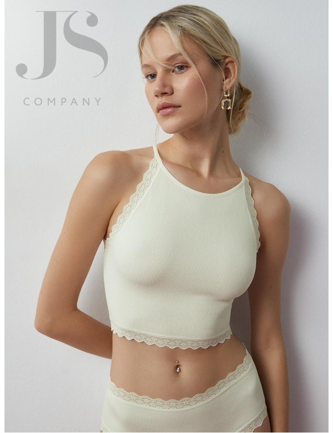 Комфортная укороченная майка "в рубчик" на тонких бретелях. Пройма и низ обработаны ажурным кружевом с изящным цветочным рисунком. Изготовлена по бесшовной технологии из мягкой микрофибры, которая отлично пропускает воздух и обладает нежной текстурой. Хорошо сохраняет форму и цвет. Майка превосходно облегает и приятно ощущается на теле благодаря отсутствию боковых швов.
