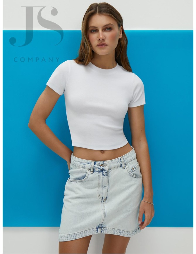 Облегающая укороченная футболка с круглым вырезом и короткими рукавами, выполненная из эластичного хлопкового полотна кашкорсе, которое отлично пропускает воздух, хорошо впитывает влагу и подходит даже для самой чувствительной кожи. Футболка стильно смотрится благодаря оригинальной вязке «английская резинка» и гармонично дополнит повседневные и деловые образы.