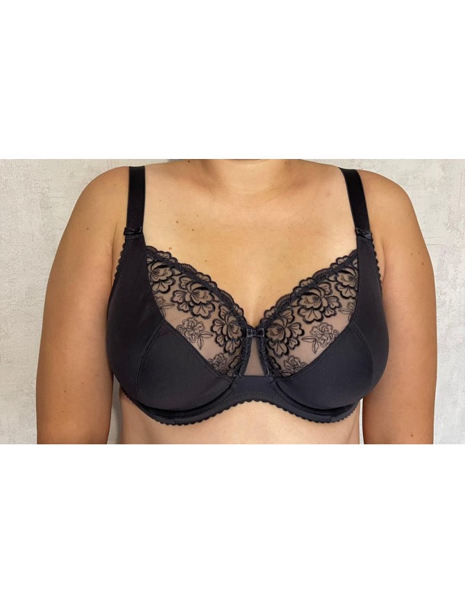 Бюстгальтер из неэластичного трикотажного полотна, неэластичной вышивки и эластичного сетчатого полотна, на каркасах. Отделка - бантики.