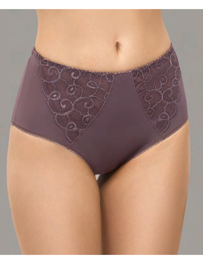 Трусы-слип c высокой линией талии. Выполнены из эластичного трикотажного полотна и эластичного кружева. Кружевные вставки на передней детали трусиков.