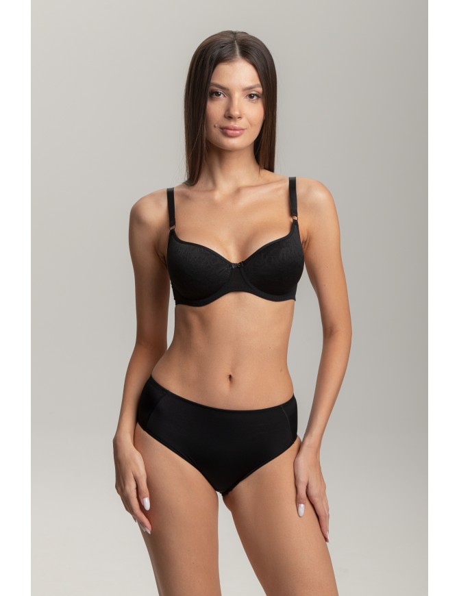 Бюстгальтер балконет, выполнен из материала spacer и эластичного полотна, отделан эластичной тесьмой. Чашка с эффектом кружева (тиснение), встроенные каркасы поддерживают грудь. Пояс бюстгальтера обеспечивает правильное расположение и надежную фиксацию на теле. Бретели без отделки, регулируются по длине.