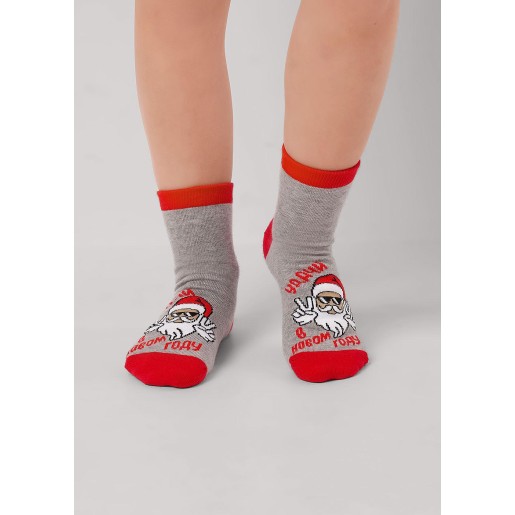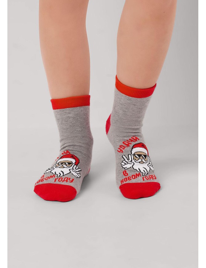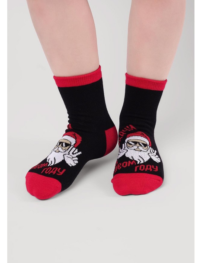 Детские носки с выделенным мыском, пяткой и бортом, с рисунком лицо деда мороза и надписью удачи в новом году