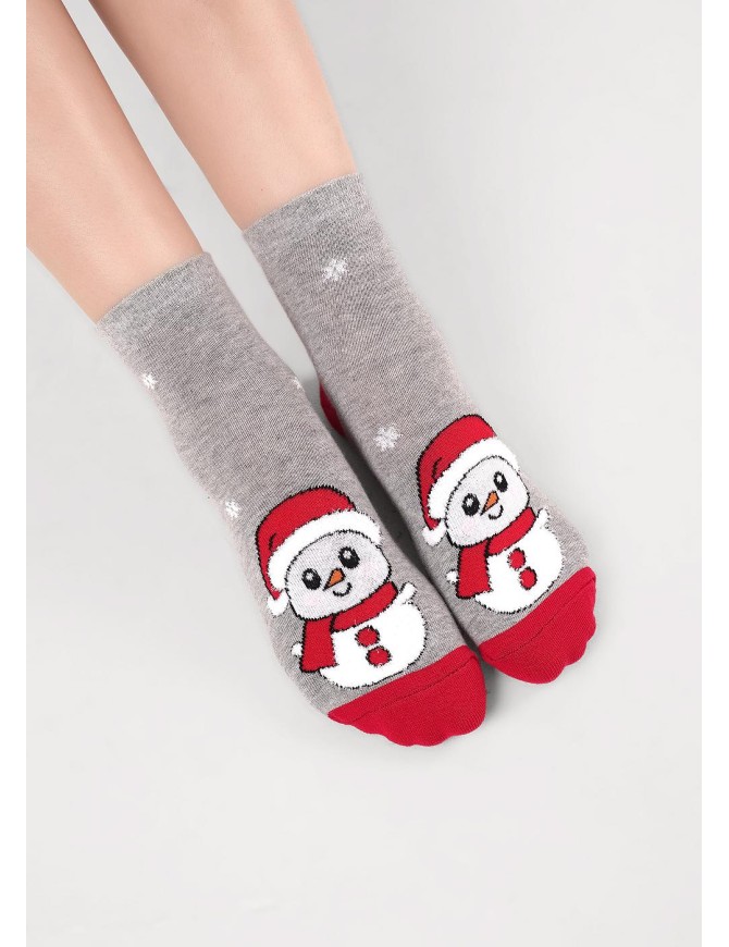 Детские носки с выделенным мысом и пяткой с рисунком снеговика, тело снеговика и отворот колпака выполнены из пряжи травка