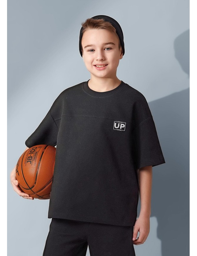 Футболка для мальчика из пике. Модель с декоративным резом по переду и стильной нашивкой. Комфортный крой, эластичная горловина. Практичная и модная базовая вещь для повседневного гардероба.