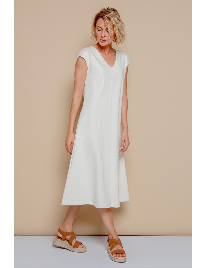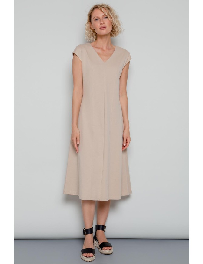 Приталенное хлопковое платье с V-образным вырезом и спущенными плечами. Сшито из однотонного футера петли в тёмно-бежевом оттенке. По центру спереди и сзади проходят швы. Впереди украшено рельефными швами.