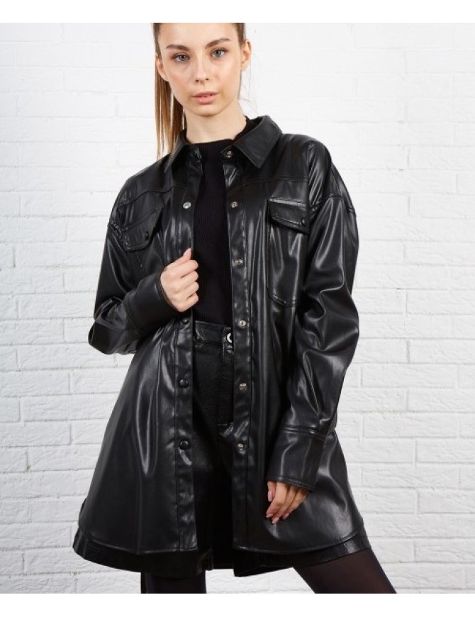 Рубашка свободного кроя для девочек. Изделие выполнено из качественной экокожи. У модели классический отложной воротник, спущенная линия плеч, накладные карманы. Рукава оформлены широкими манжетами. Застёжка - практичные кнопки в тон с одной контрастной. Модель дополнена принтованным ремнем с пряжкой.