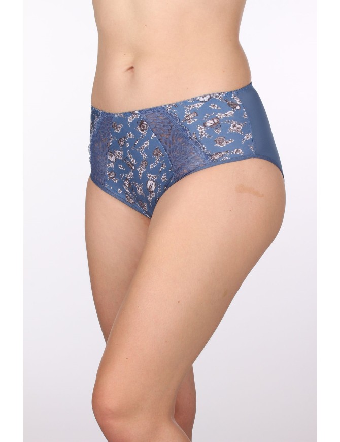 Трусы из эластичного принтованного полотна, эластичного кружева, х/б ластовица, с высокой линией талии. Отделка эластичной декоративной тесьмой.
