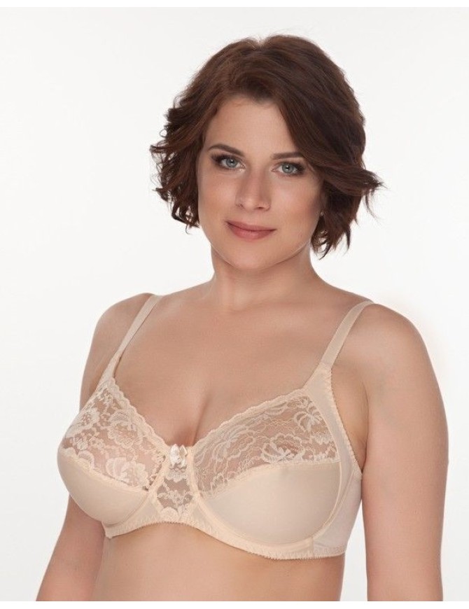 Бюстгальтер из неэластичного трикотажного полотна и кружева, на каркасах. Мягкие чашки с двойным членением и боковой корректирующей деталью. Верхние части чашек на подкладке из неэластичного сетчатого полотна. Боковая корректирующая деталь группирует грудь к центру. Отличная поддержка бюста.