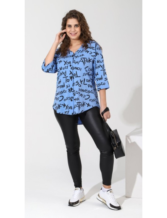 Туника женская из трикотажного полотна «кулирка» с набивным рисунком, свободного покроя, с горловиной овальной формы, обработанной спереди притачными фигурными планками, втачными рукавами длиной 3/4, центральной бортовой застежкой на петли и пуговицы и фигурной линией низа.