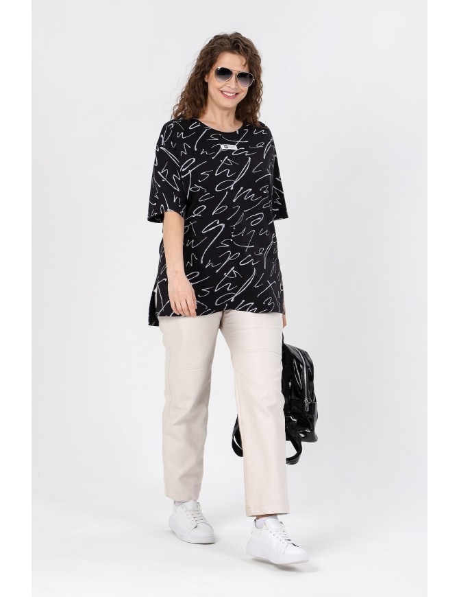 Футболка женская из трикотажного полотна «кулирка» с набивным рисунком, свободного покроя, со спущенным плечом и втачными рукавами длиной до локтя, горловиной овальной формы, обработанной втачной планкой, по центру полочки настрочен декоративный элемент, в нижней части боковых швов – разрезы.
