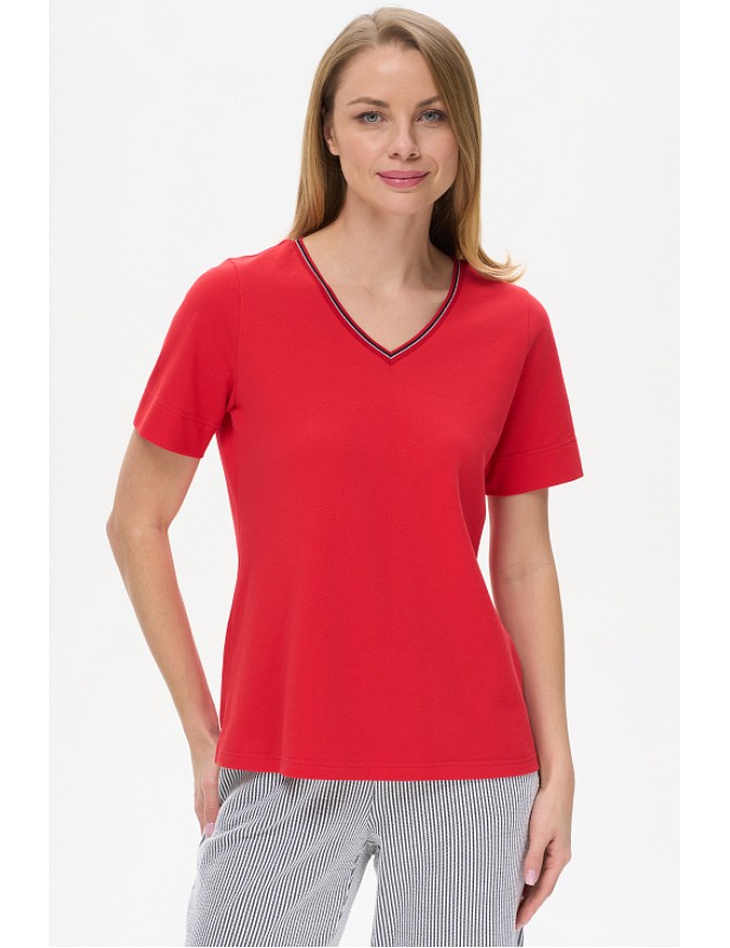 Футболка выполнена из хлопкового полотна пике. V-образный вырез горловины оформлен декоративной тесьмой, короткие рукава. Рост модели на фото 178см.