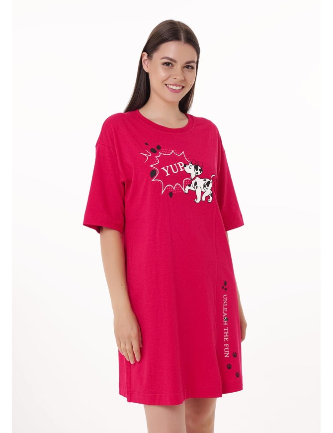 Платье для дома и отдыха из хлопкового трикотажного полотна прямого кроя. Округлая горловина с обтачкой. Короткий втачной рукав. По переду рез с разрезом .Спереди принт.