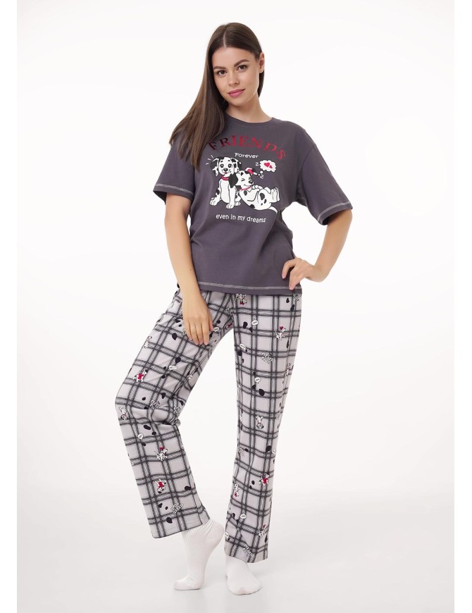Набор одежды из трикотажного полотна.Футболка прямого кроя,втачной рукав,горловина с обтачкой.Спереди принт фольга.По низу рукава,изделия застил.Брюки с притачным поясом на резинке,спереди имитация гульфика с пуговицами.Боковые карманы с отрезным бочком.