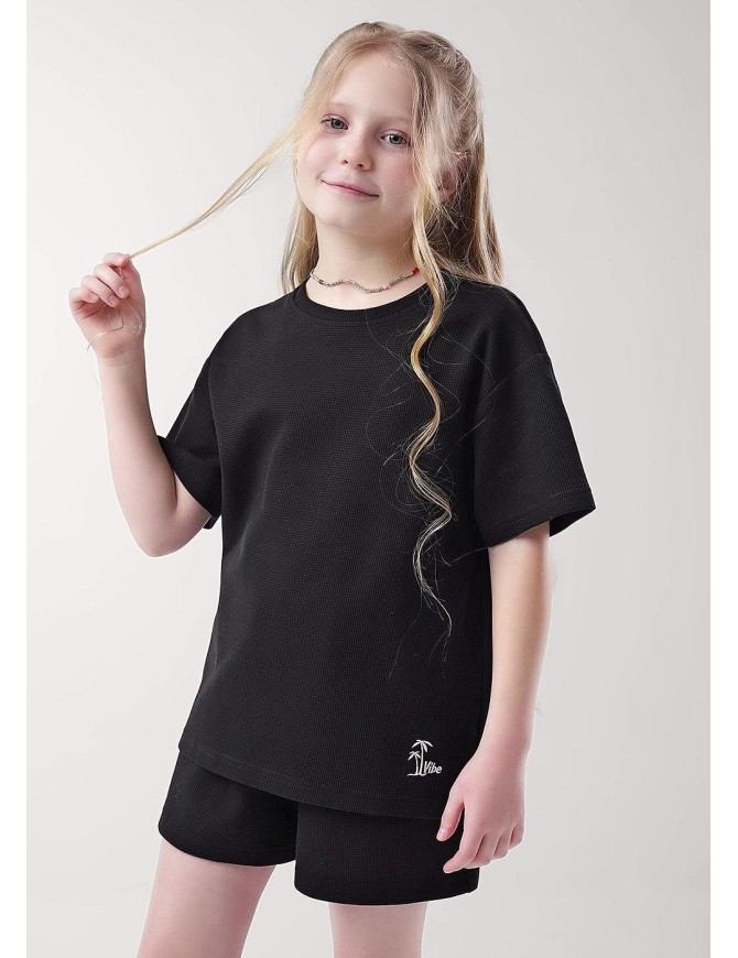Футболка среднего обьема из трикотажного "вафельного" полотна. Горловина оформлена эластичной обтачкой из основы. Спереди вышивка в летней тематике.