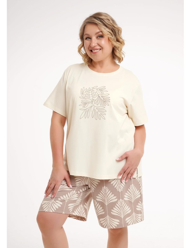 Набор одежды из хлопкового трикотажного полотна. Футболка прямого кроя. Округлая горловина с обтачкой, короткий втачной рукав. Боковые разрезы. Спереди принт вспенка. Шорты свободного кроя, пояс на внутренней резинке. Боковые карманы с отрезным бочком.