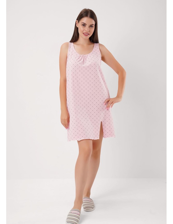 Ночная сорочка из хлопкового трикотажного полотна с добавлением эластана. А-образного силуэта на бретелях. Округлая горловина. По горловине и пройме окантовка с фестоном, спереди по центру горловины бант. По низу изделия мелкий оверлок, разрез.