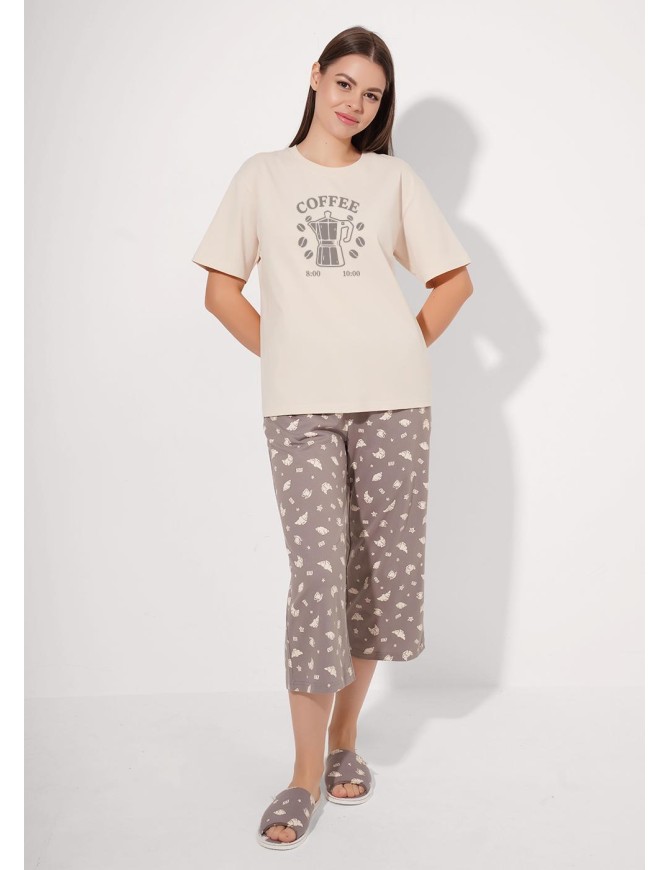 Набор одежды для дома и отдыха из хлопкового трикотажного полотна. Футболка прямого кроя. Короткий втачной рукав. Округлая горловина с обтачкой. Спереди принт. Бриджи с поясом на внутренней резинке, спереди нашивка. Боковые карманы с отрезным бочком.