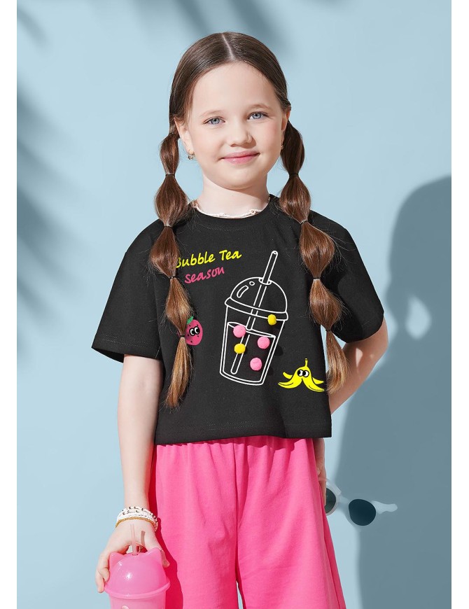Укороченная футболка из хлопка для девочки. Круглый вырез горловины оформлен эластичной окантовкой. По центру переда трендовый принт с декором. Сочетай футболку с брюками и шортами из новой коллекции!