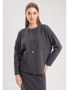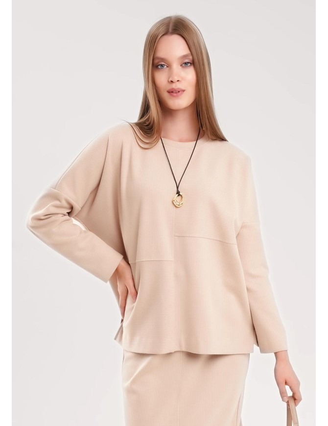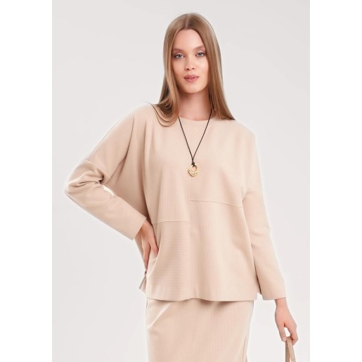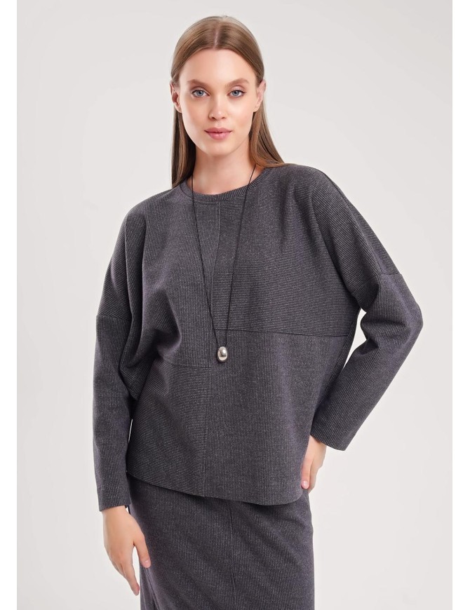 Джемпер свободного кроя из трикотажного поливискозного полотна джерси. Спущенный длинный рукав. Округлая горловина с обтачкой. Спереди резы с разным направлением полос. Боковые разрезы. По низу рукава и изделия потайной стежок.
