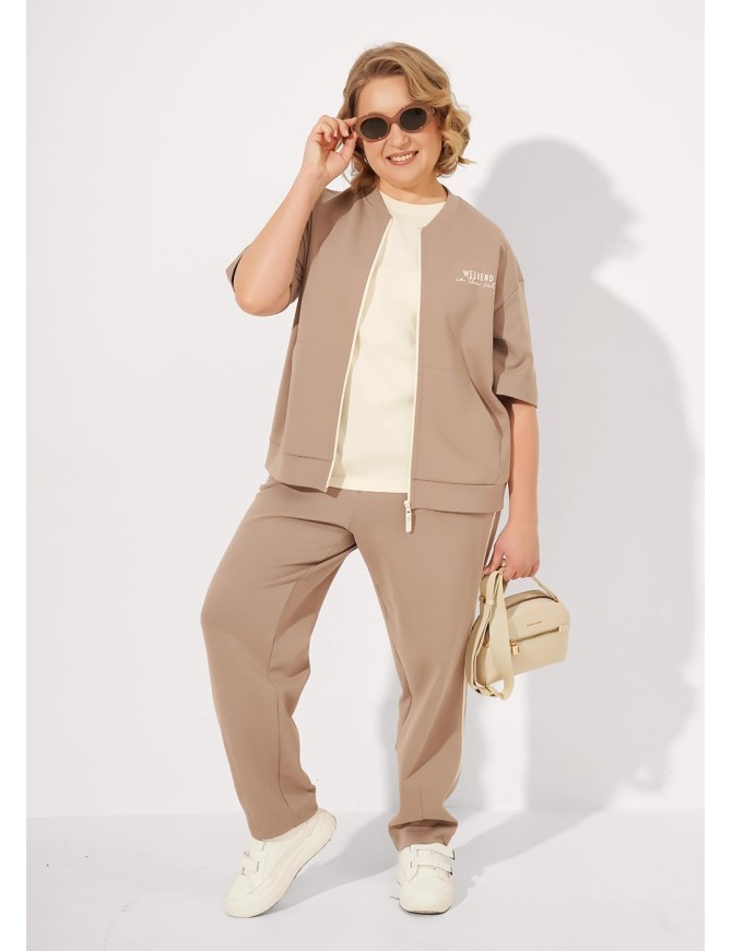 Куртка свободного кроя из трикотажного полотна дабл фейс на молнии. Короткий втачной рукав. По горловине стойка. Спереди карман-кенгуру. По низу изделия манжет. Спереди принт.