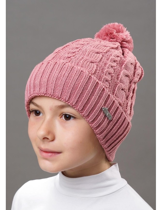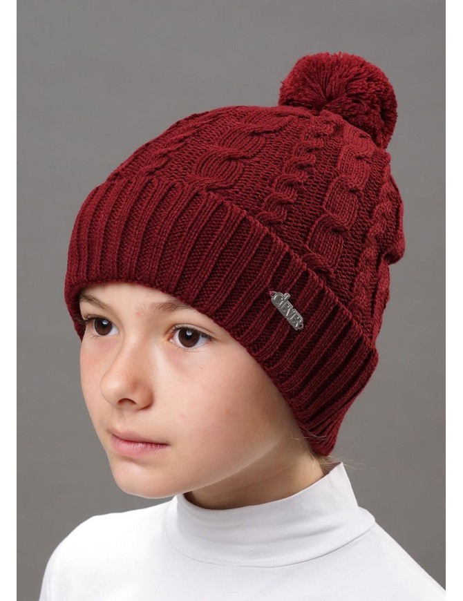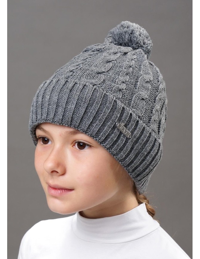 Детская шапка на флисовом подкладе, выполнена фактурным переплетением косы из акриловой пряжи и декорирована ниточным помпоном и нашивкой на отвороте.