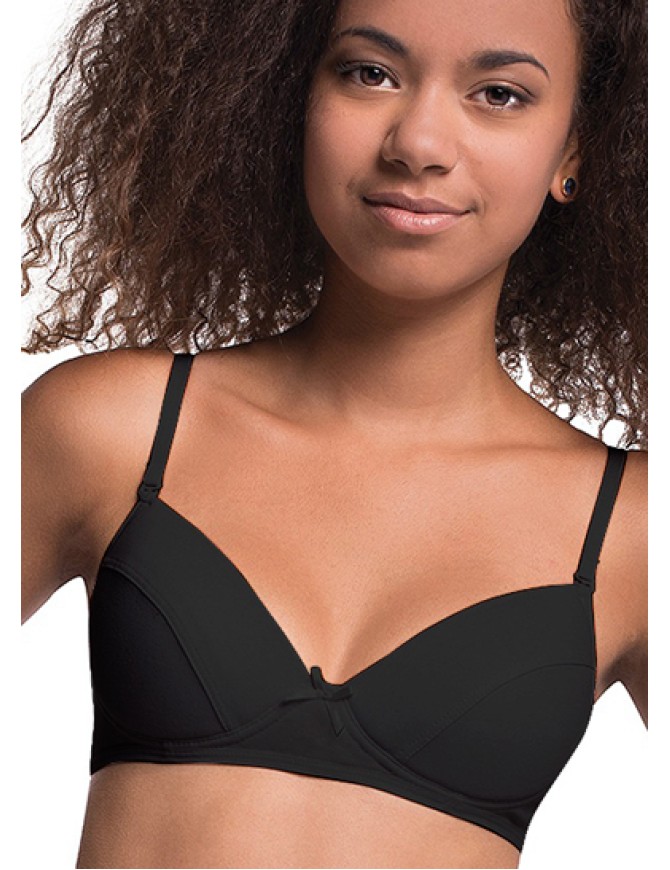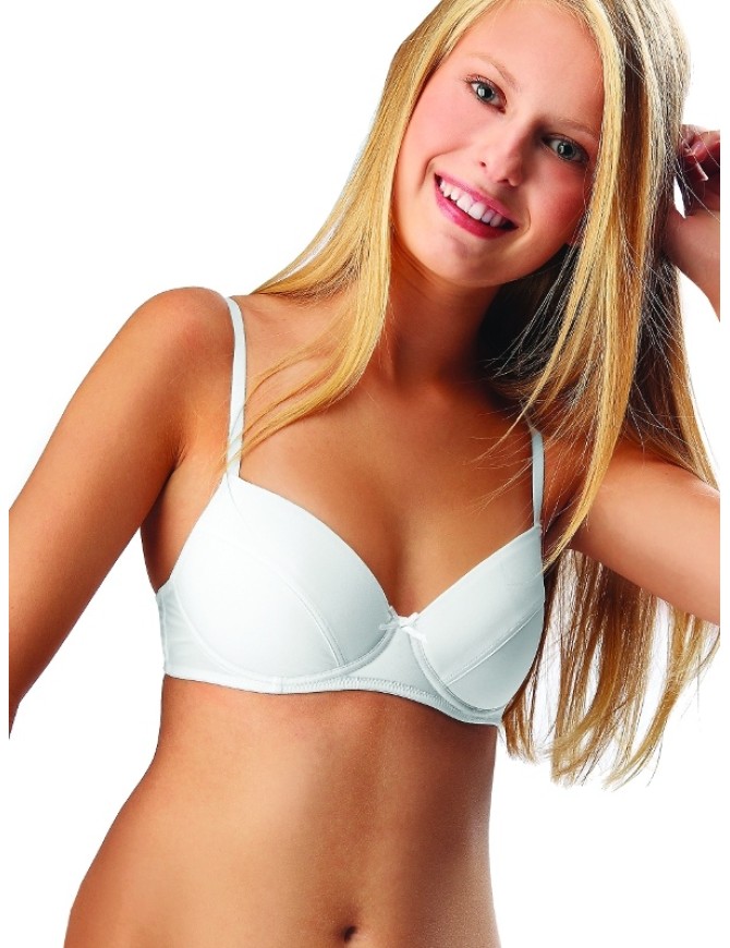 Бюстгальтер для девочек-подростков изготовлен из хлопка с эластаном. Плотные чашечки на тонком поролоне, регулируемые по длине бретели. Спереди декорирован бантиком.