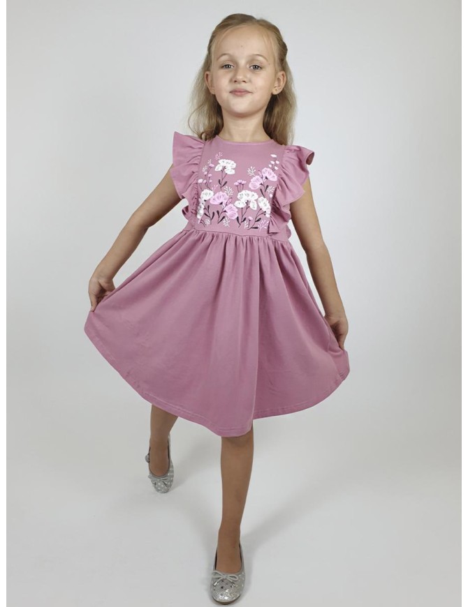 Платье- полуприлегающего силуэта. Отрезная юбка со сборкой, рельефы с рюшей. Печать на переде. Горловина окантована и подшита, застежка сзади на пуговицы.