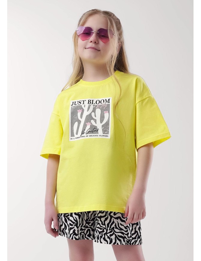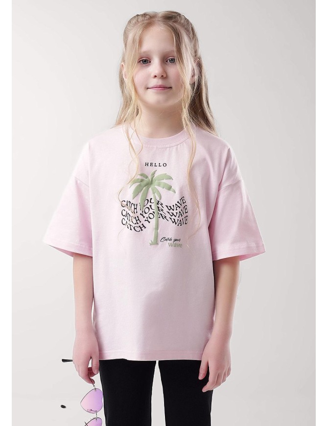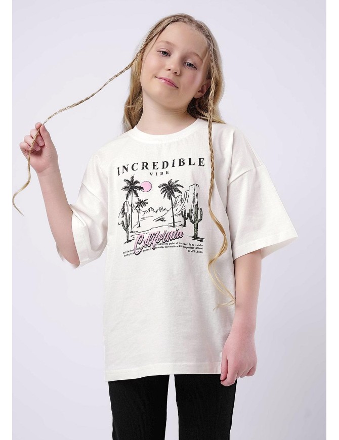 Оверсайз футболка для подростка из 100% хлопка. Горловина оформлена эластичной обтачкой из кашкорсе. Спереди актуальный принт.