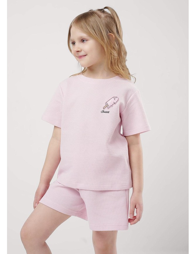 Футболка среднего обьема из трикотажного "вафельного" полотна. Горловина оформлена эластичной обтачкой из основы. Спереди нашивка патч и вышивка в летней тематике.