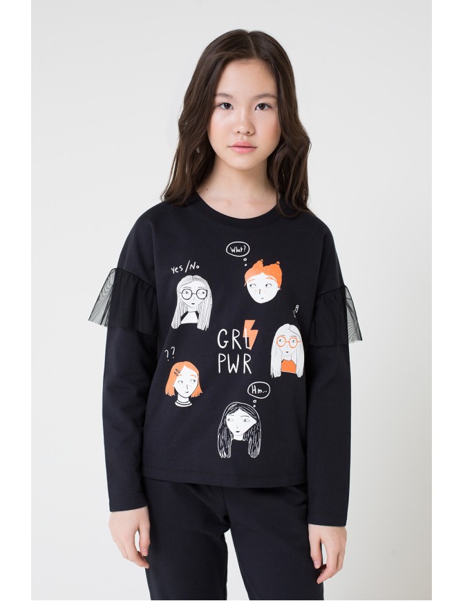 Джемпер из однотонного футера. Эластичная горловина. Длинные рукава со спущенным плечом, крылышки из сетки. Спереди принт.