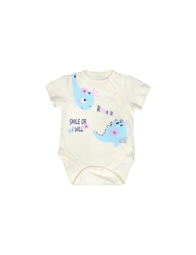 Полукомбинезон (боди).Застежка ассиметричная на переде слева(справа) и по низу изделия на кнопки. Рукав втачной короткий, печать на переде. Горловина, край борта и низ изделия окантованы.