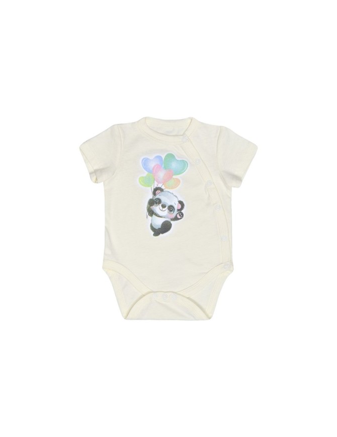 Полукомбинезон (боди).Застежка ассиметричная на переде слева(справа) и по низу изделия на кнопки. Рукав втачной короткий, печать по переду. Горловина, край борта и низ изделия окантованы.