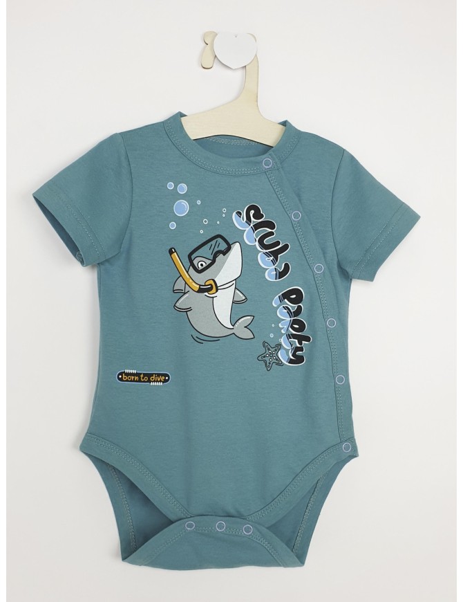 Полукомбинезон(боди)-застежка ассиметричная на переде слева(справа) и по низу изделия на кнопки.Рукав втачной короткий. Перед с печатью.Горловина,край борта и низ изделия окантованы.