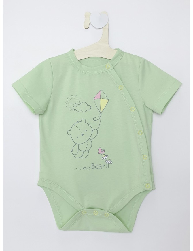 Полукомбинезон(боди)-застежка ассиметричная на переде слева(справа) и по низу изделия на кнопки.Рукав втачной короткий. Перед с печатью.Горловина,край борта и низ изделия окантованы.
