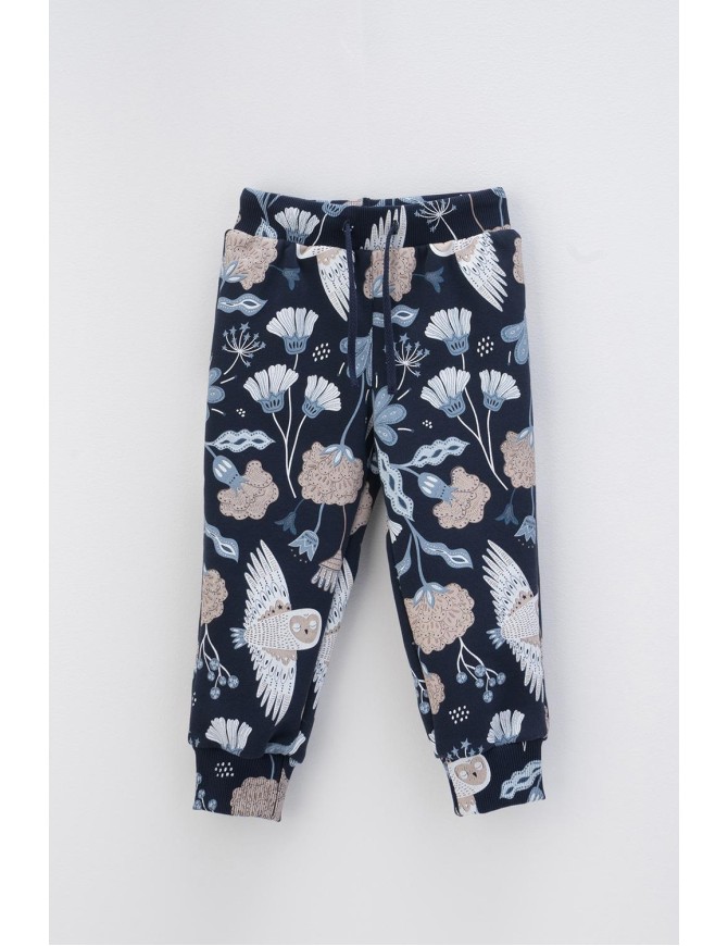 Трикотажные брюки для девочки из петельчатого футера. В составе 80% натурального хлопка и 20% полиэстера, при этом полиэстер ввязан внутрь по особой технологии и не соприкасается с кожей. Эластичный пояс на резинке регулируется по ширине с помощью шнурка, внизу эластичные манжеты. Оригинальная набивка выполнена из стойких текстильных красителей.
