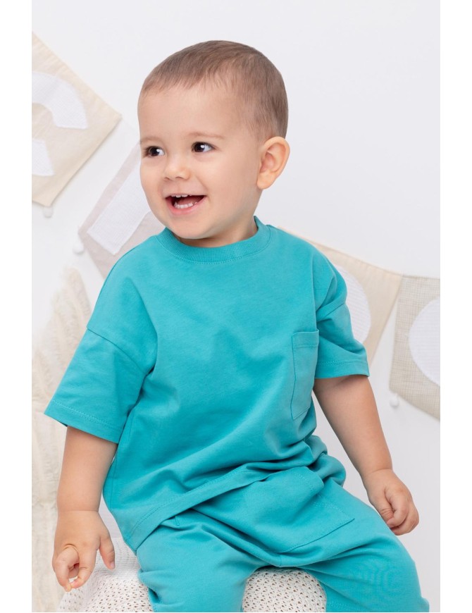 Однотонная футболка для мальчика из высококачественного трикотажного полотна. Накладной карман спереди. Для удобства застежка на кнопки на спинке.
