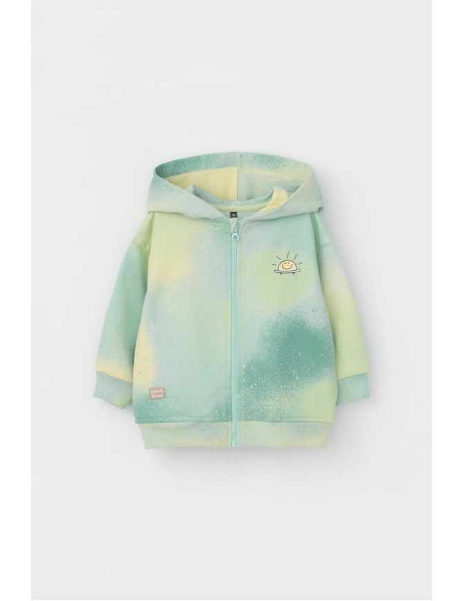 Трикотажная куртка с капюшоном для мальчика из набивного петельчатого футера. Модель с боковыми карманами. Манжеты и пояс из эластичного трикотажа в рубчик.