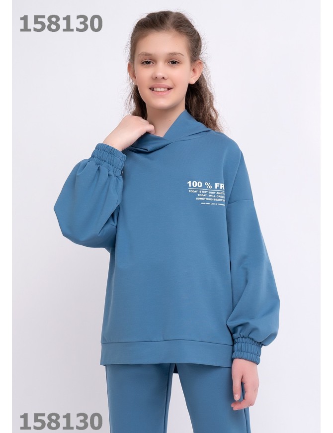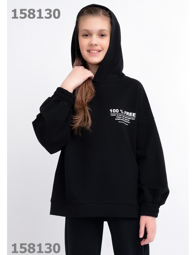 Толстовка с капюшоном из футера (хлопок с эластаном). Оригинальность модели придает объем в рукавах, модная графика принтов и стильная посадка. Рукава и низ на эластичной манжете, низ оформлен поясом. Спереди принт.