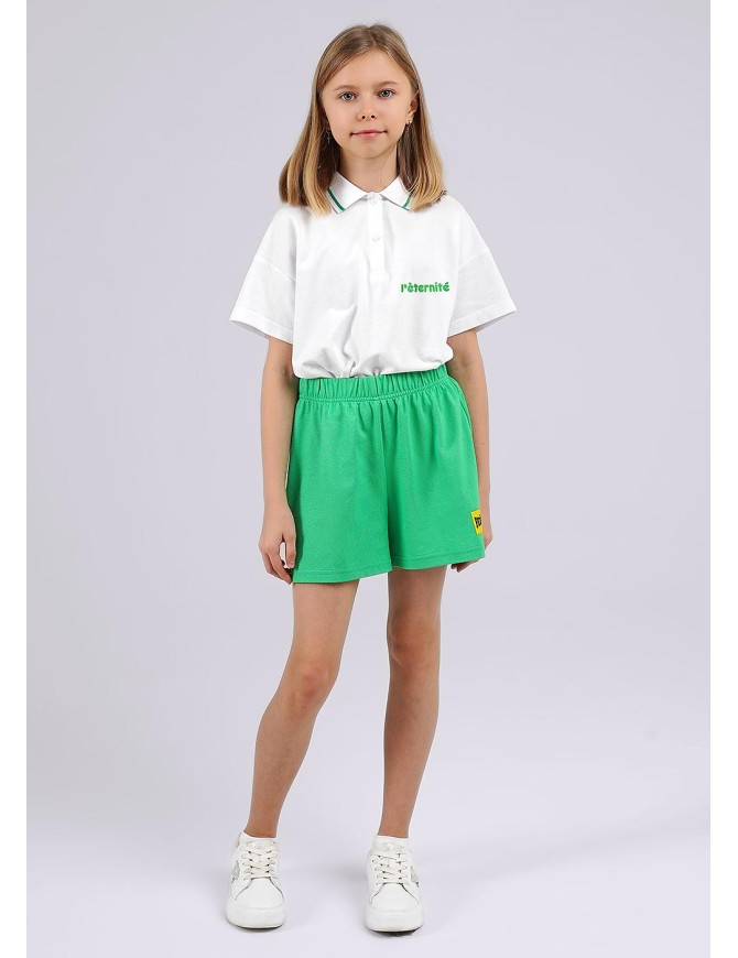 Прямые шорты в трендовом зеленом оттенке выполнены из пике - приятный и дышащий материал. Спереди лаконичная нашивка. Эластичный пояс, регулировка шнуром. Сочетайте модель с однотонными или принтованными футболками из коллекции.