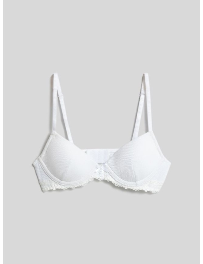 Детский белый бюстгальтер с кружевной оторочкой. Модель с чашками из хлопковой ткани хорошо подходит для повседневного ношения и не раздражает нежную детскую кожу. Изделие дополняет и украшает декоративное кружево. Несъёмные бретели регулируются по длине. На спинке расположена металлическая застежка на два крючка. По центру модели, меж чашек, пришиты декоративные пуговицы.