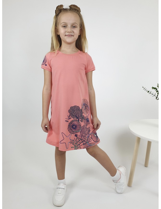 Платье-силуэт трапеция.Короткий втачной рукав на манжете,справа печать.Перед с печатью и вышивкой-пайетки,сбоку разрезы.Горловина обработана планкой.