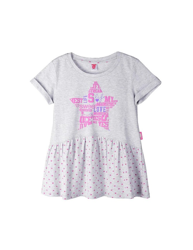 Туника для девочки из однотонного супрема, короткий втачной рукав с отворотом, по горловине обтачка, нижняя часть отрезная со сборкой из набивного супрема, печать на полочке, жаккард в боковом шве.