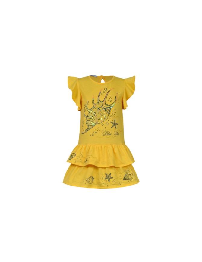 Платье-силуэт трапеция,короткий рукав-волан,юбка из двух воланов с печатью.Застежка по спинке капелька на пуговицу.Горловина окантована.Печать и вышивка-пайетки на переде.
